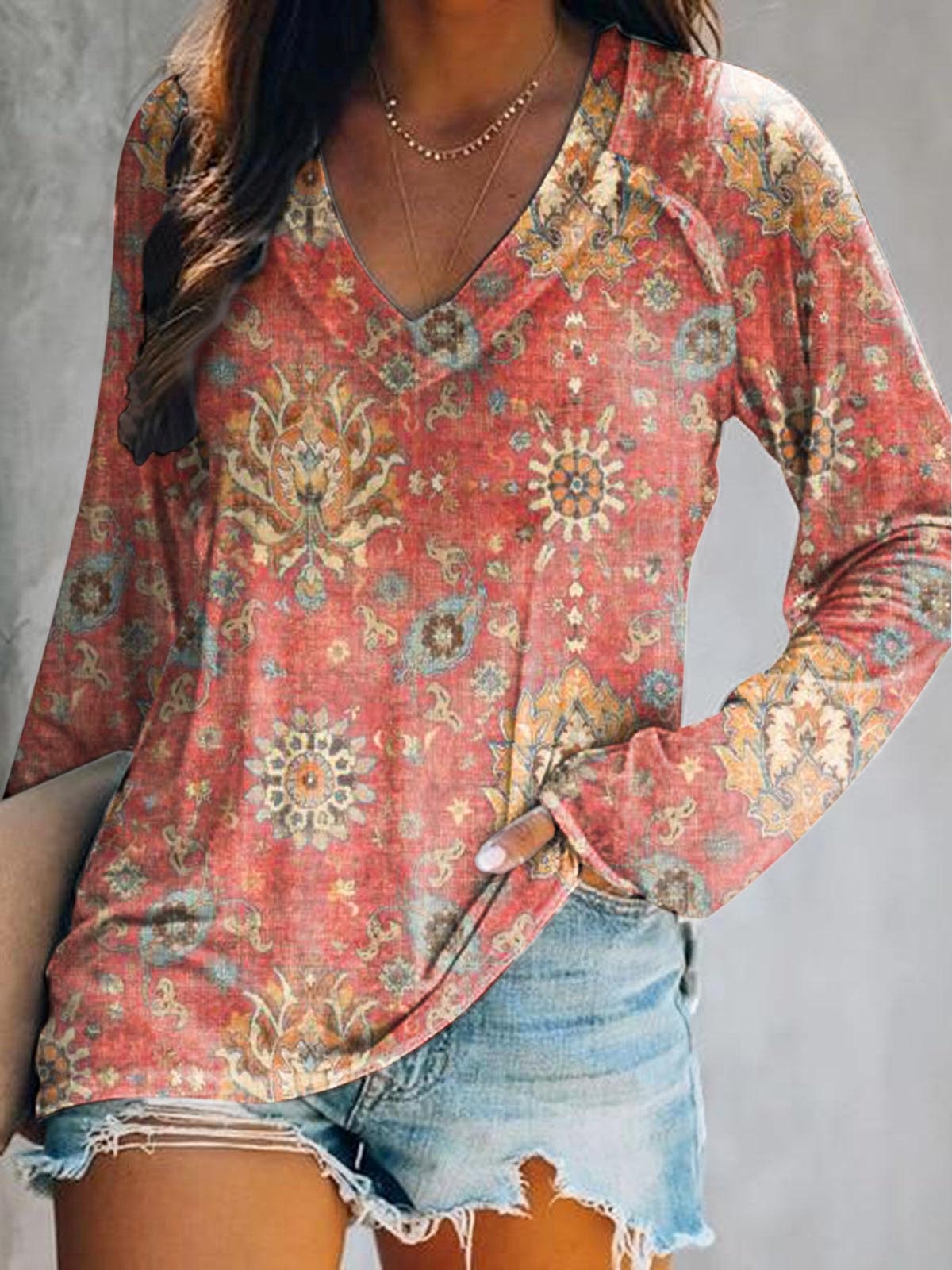 Women's Retro Ethnic Totem Art Print Casual V-neck Long Sleeve T-shirt