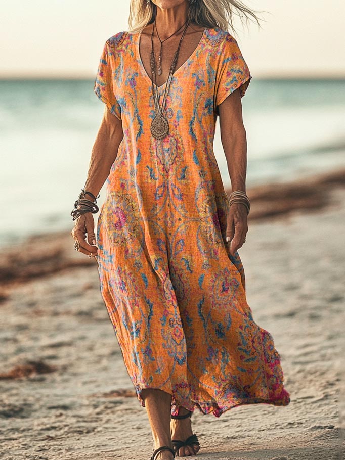Women's Retro Ethnic Totem Print Pocket Cotton Dress