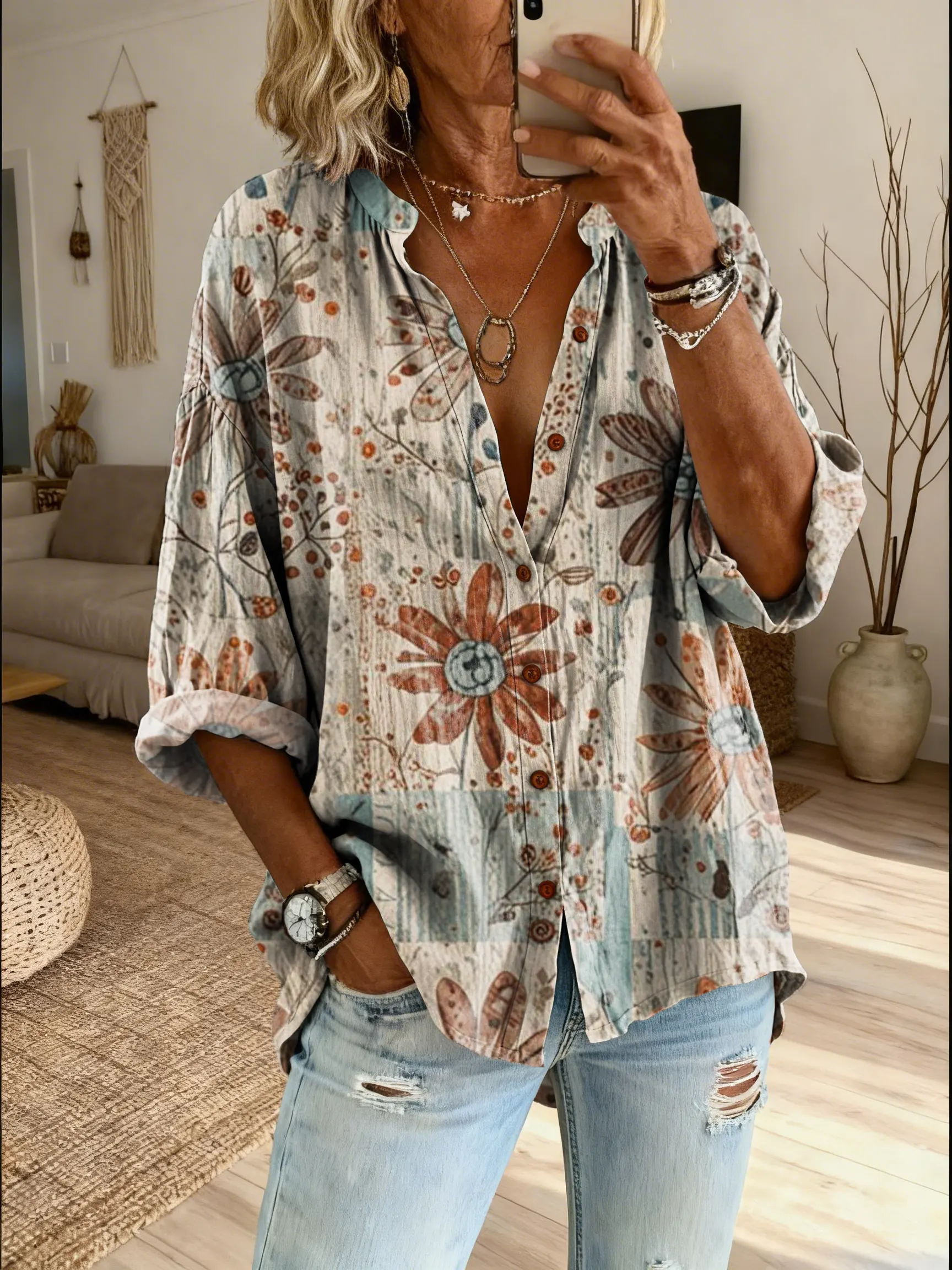 Women's Retro Floral Art Print Casual Cotton Linen Shirt