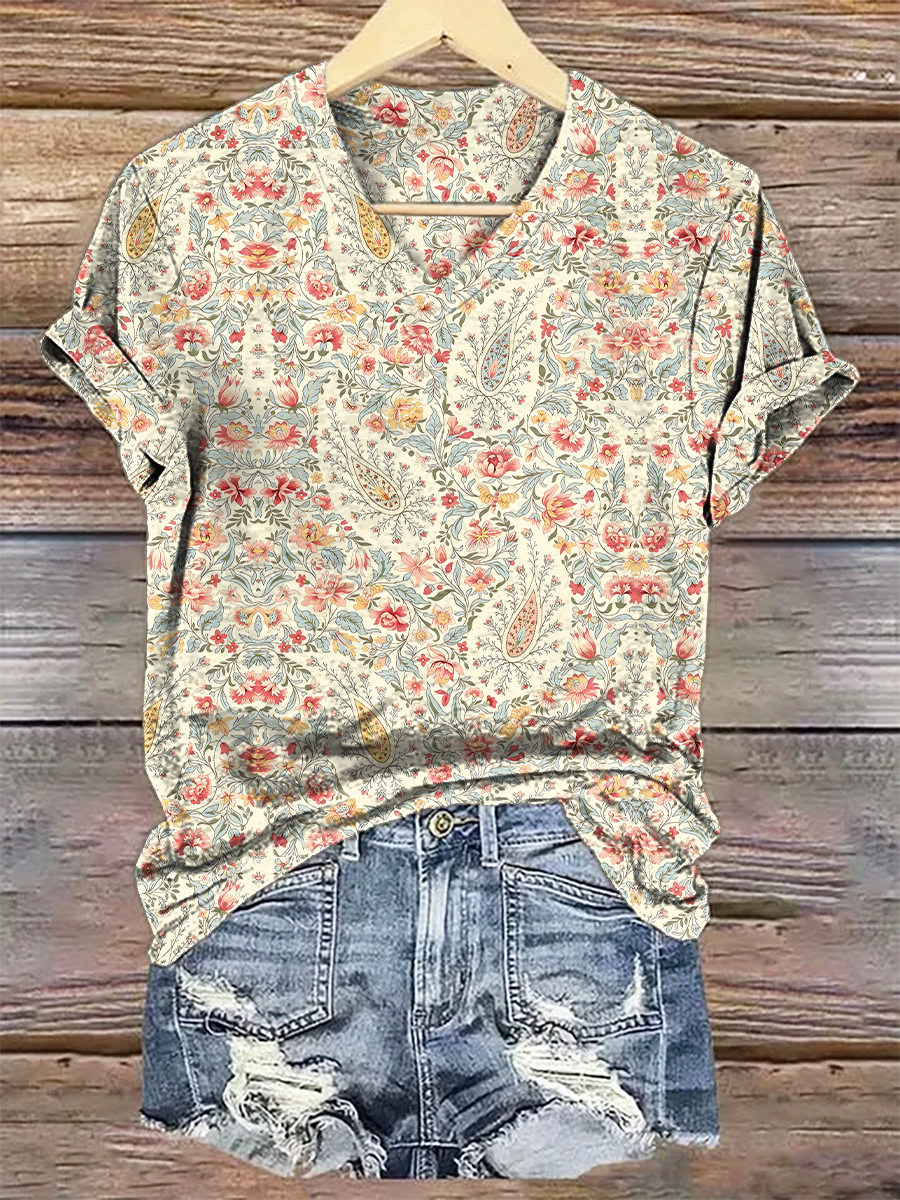 Women's Retro Paisley Floral Art Print V-neck Casual T-Shirt