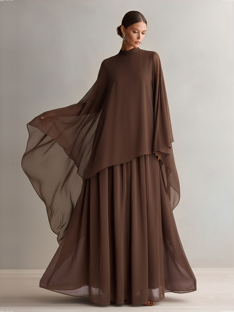 A rich brown chiffon dress with a flowing maxi skirt and cape-inspired layers. It offers a modern, elegant-glam look for formal events and special occasions.