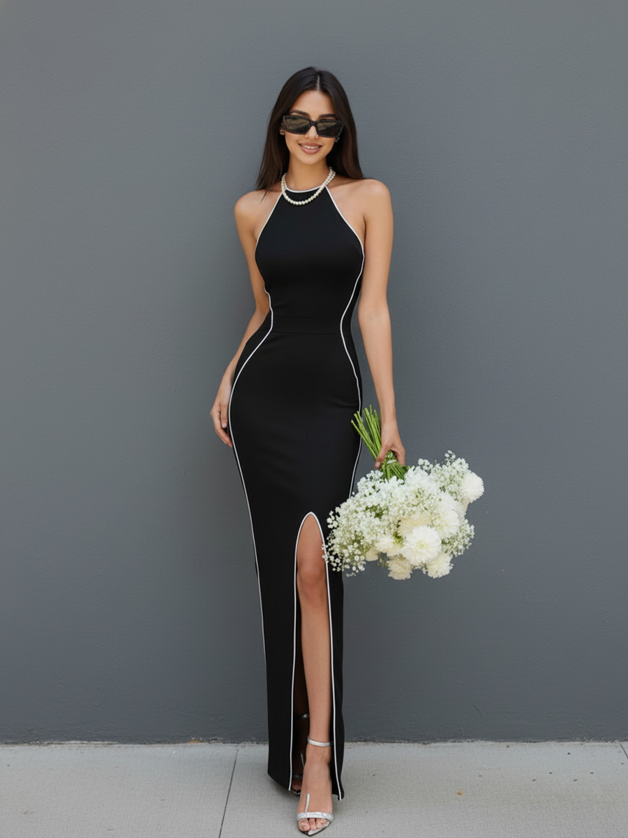 This black knit maxi dress features a halter neckline, white piping, and a high slit for a sleek and modern look. The slim shape gives it a bold and elegant style.