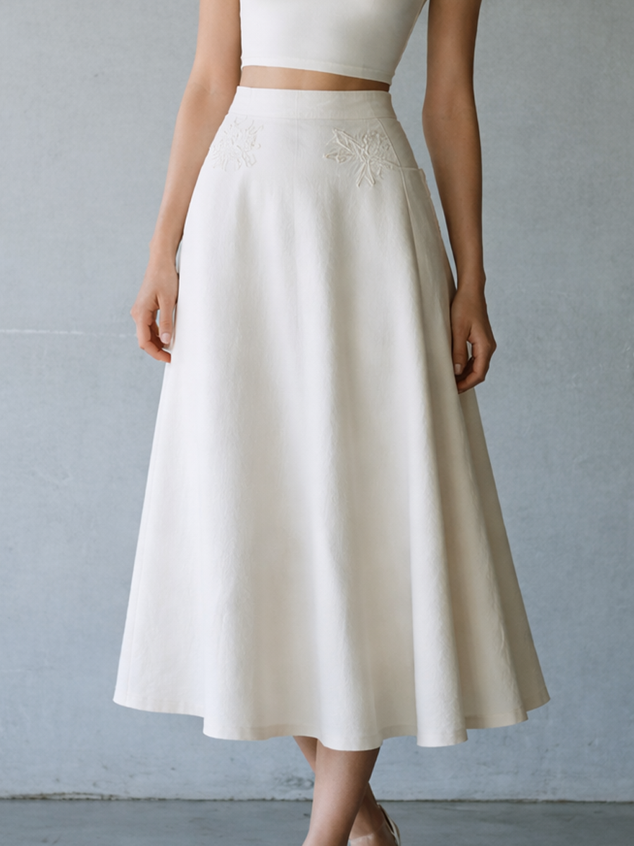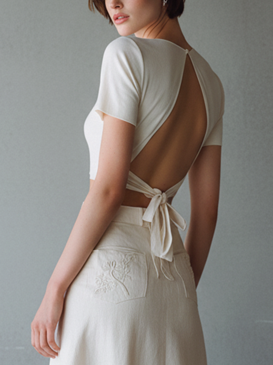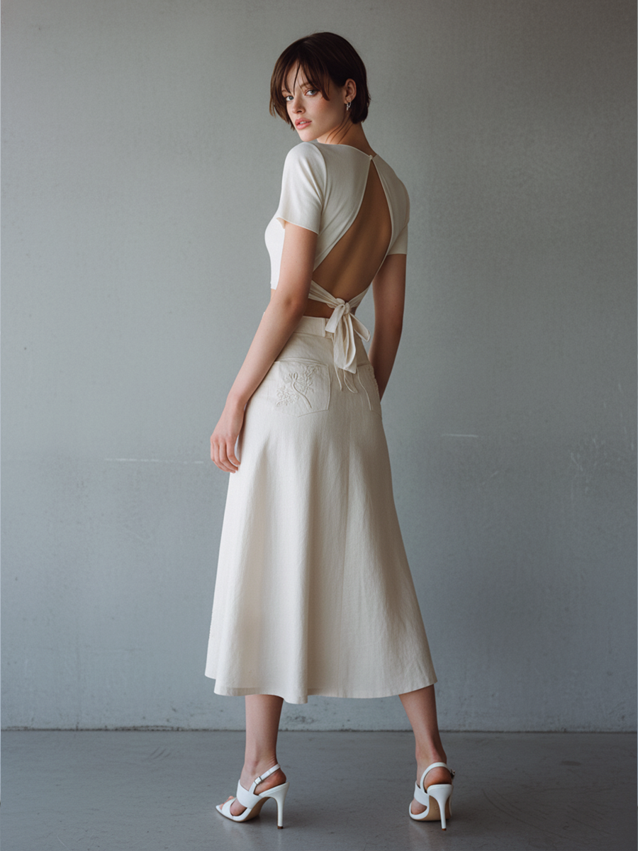 This elegant two-piece set features a minimalist short-sleeve knit top with a refined open-back tie design, paired with a softly structured embroidered midi skirt. The clean silhouette and subtle detailing create a timeless, feminine look suitable for both refined casual and semi-formal settings.