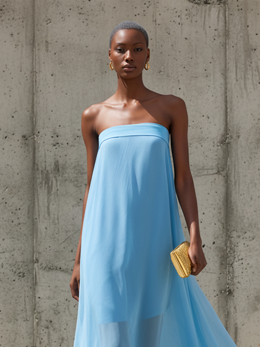 A sky blue chiffon midi dress with a strapless straight neck. It features an asymmetric high-low hem for a clean, elegant look.