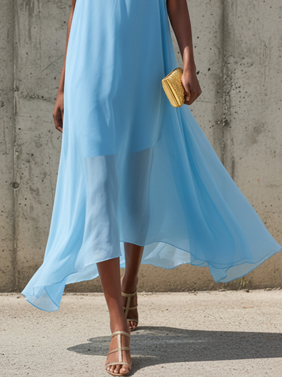 Women’s Sky Blue Chiffon Midi Dress With Strapless Straight Neck & Asymmetric High-Low Hem, Timeless Minimalist-Elegant Style Dress
