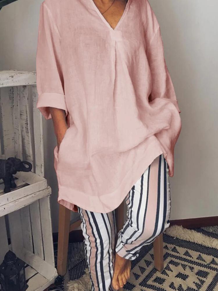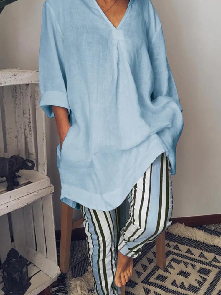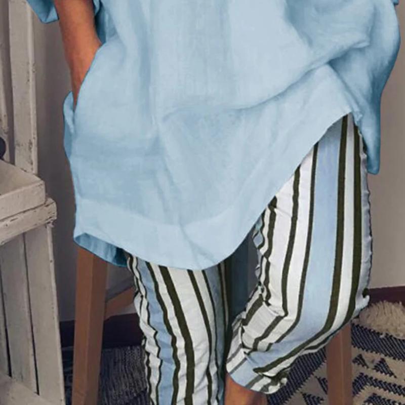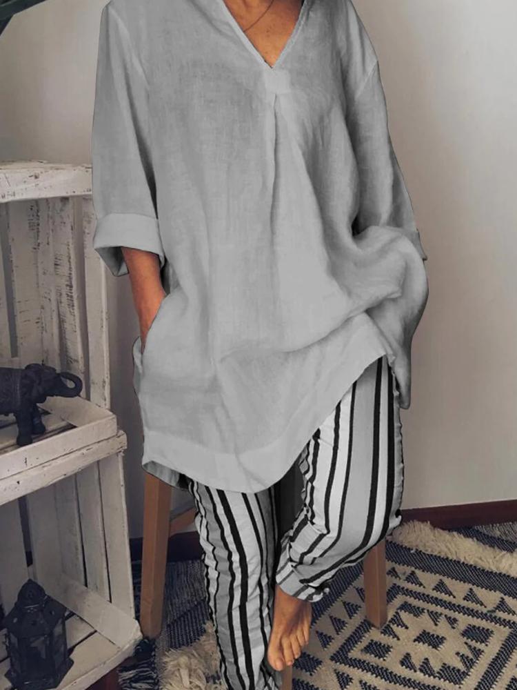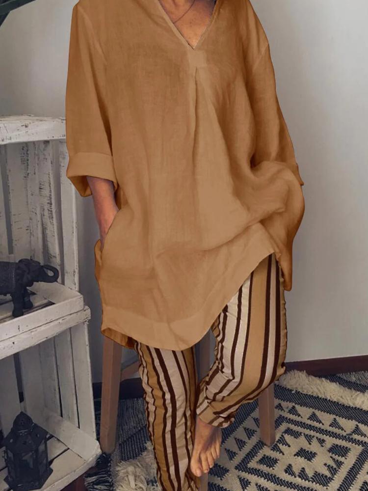 Women's Solid V Neck Long Sleeve Casual Top And Striped Pants