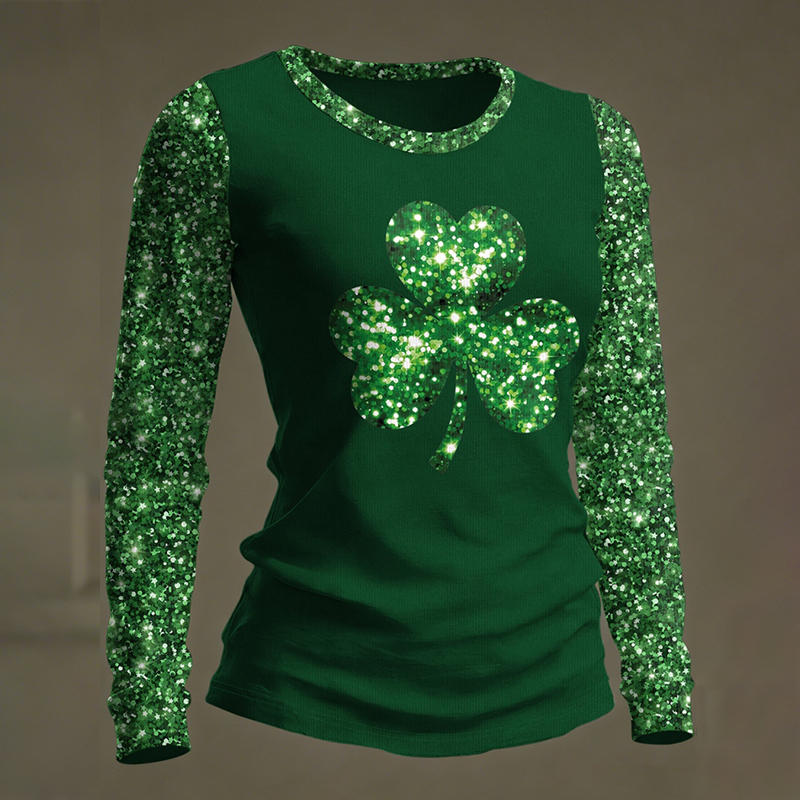 Women's St. Patrick's Day Shamrock Print Round Neck Long Sleeve T-shirt