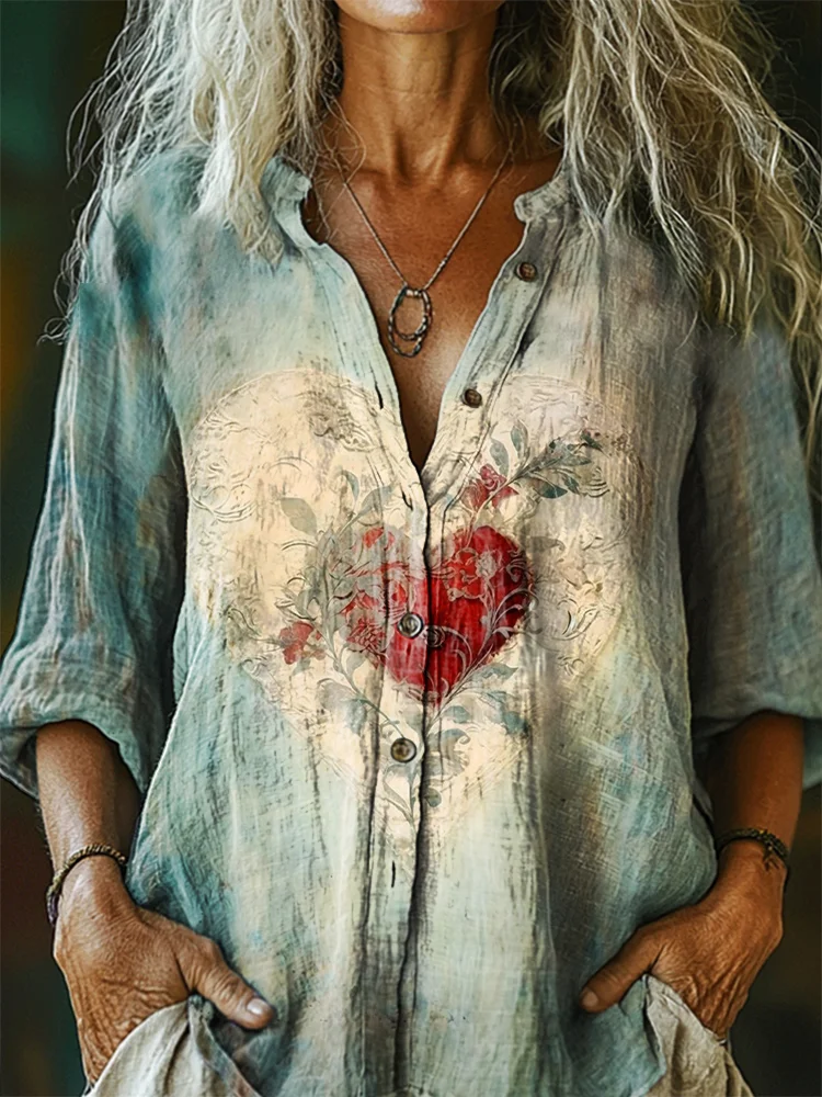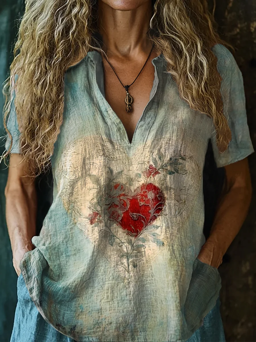 Women's V-Neck Casual T-Shirt with Heart Tattoo Art Print