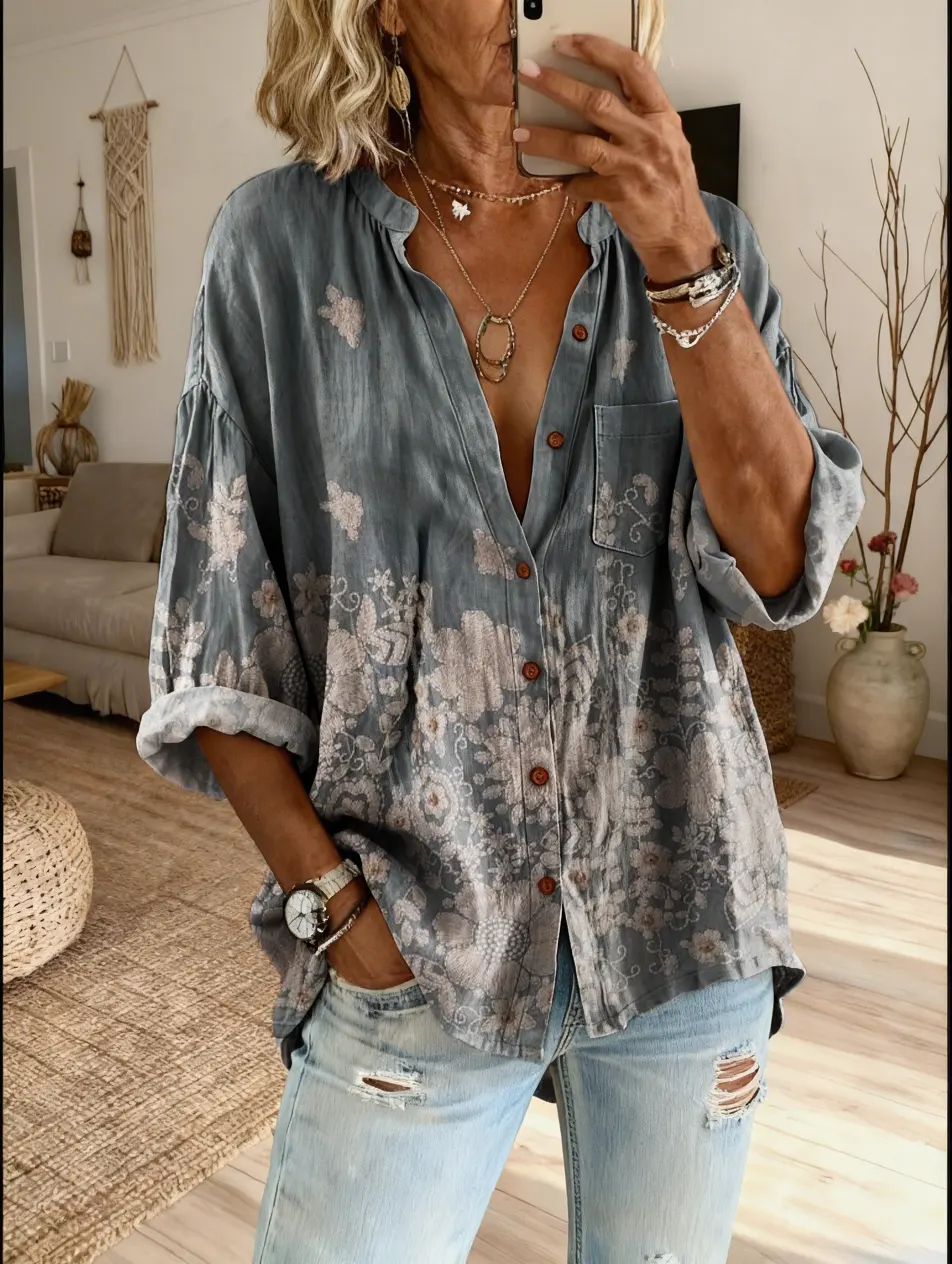 Women's Vintage Distressed Floral Art Print Casual Cotton-Linen Blend Shirt