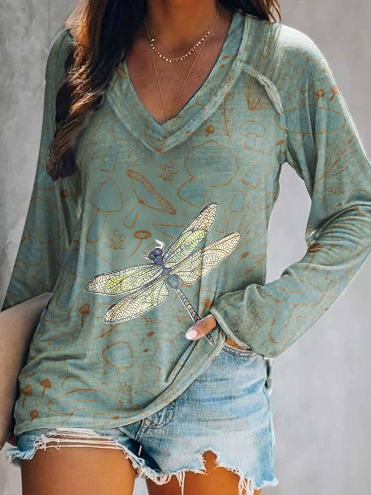 Women's Vintage Dragonfly Art Print V Neck Long Sleeve Tops