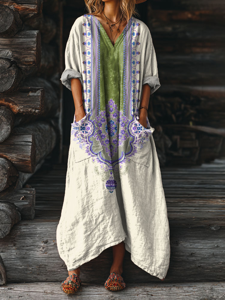 Women's Vintage Ethnic Embellished Patterns Art Printed Pockets V-Neck Cotton Dresses