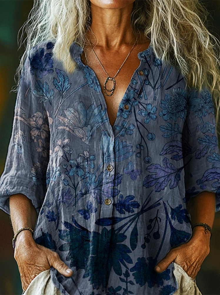 Women's Vintage Ethnic Floral Art Pattern Print Casual Cotton Linen Shirt