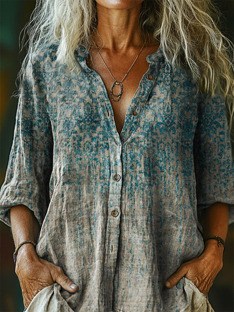 Women's Vintage Ethnic Floral Art Print Casual Cotton And Linen Shirt