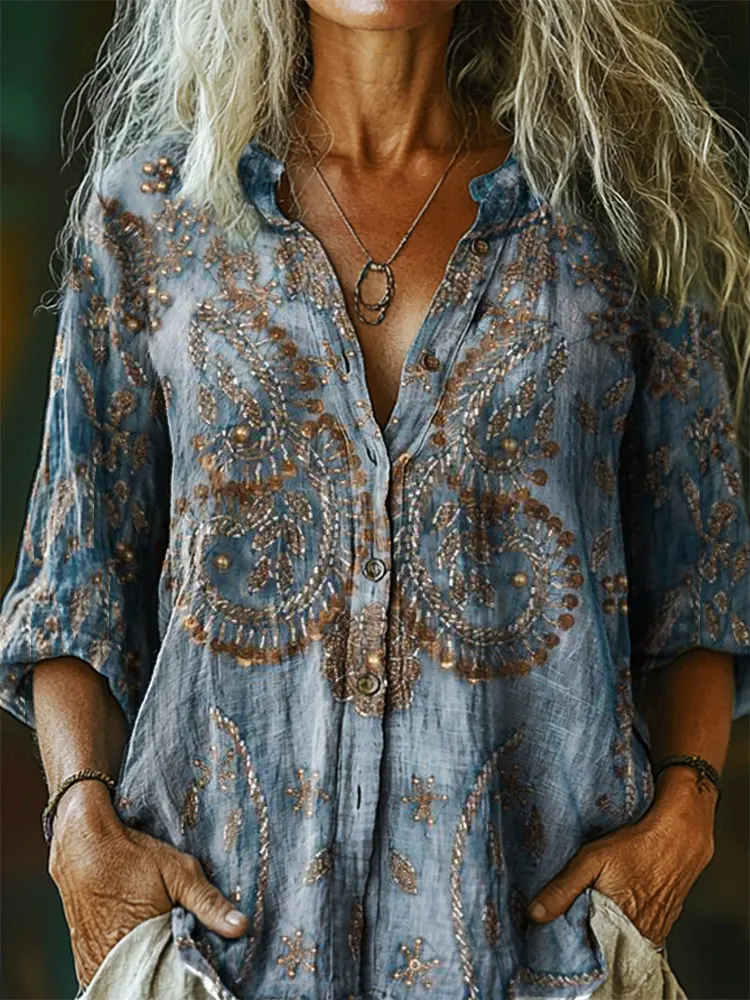 Women's Vintage Ethnic Floral Pattern Art Print Casual Cotton Shirt