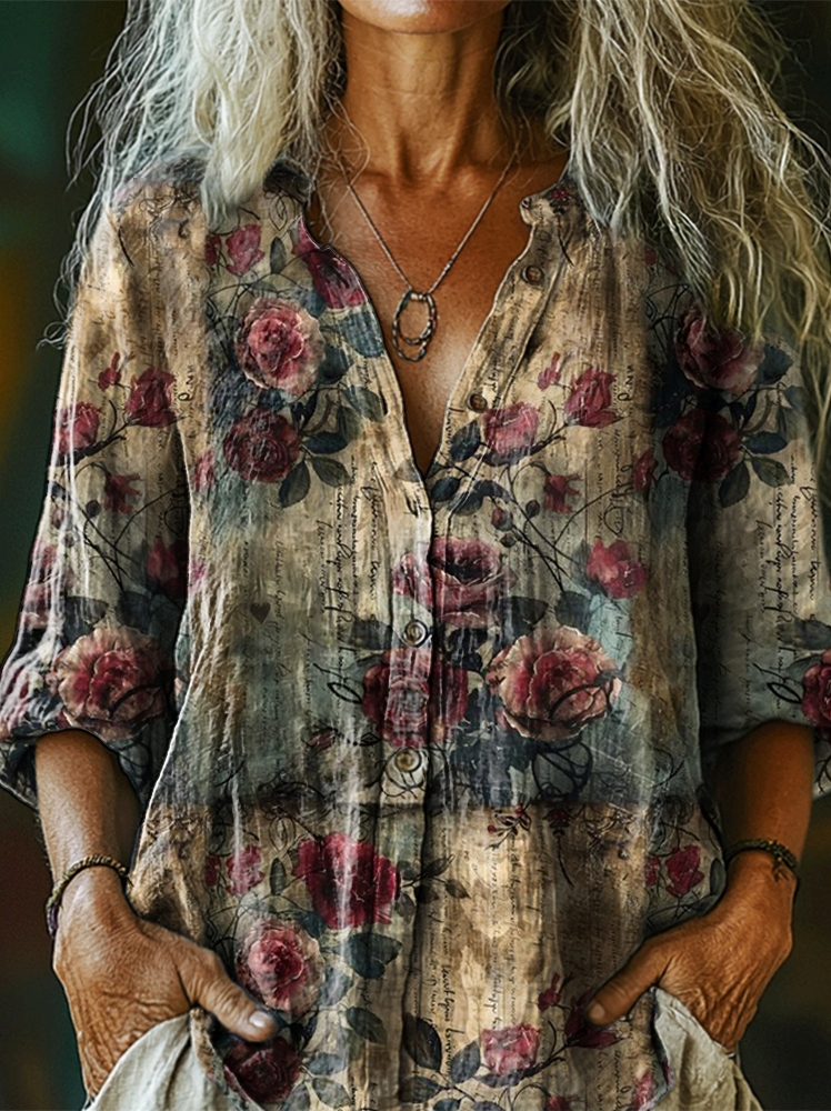 Women's Vintage Floral Art Pattern Print Casual Cotton Linen Shirt