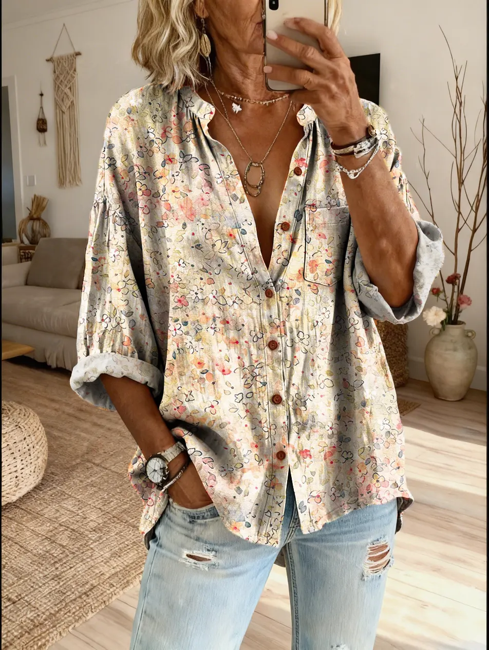 Women's Vintage Floral Art Print Casual Cotton-Linen Blend Shirt
