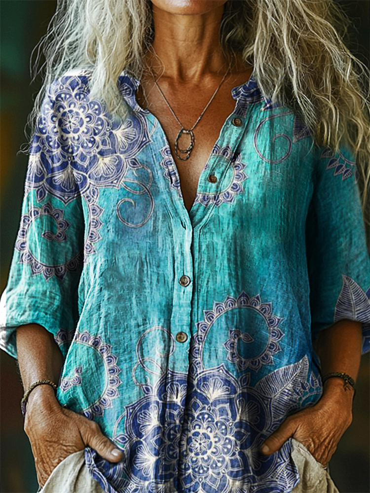 Women's Vintage Floral Art Print Casual Cotton Linen Shirt