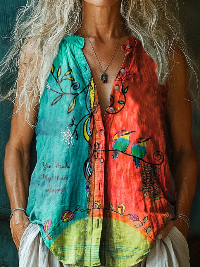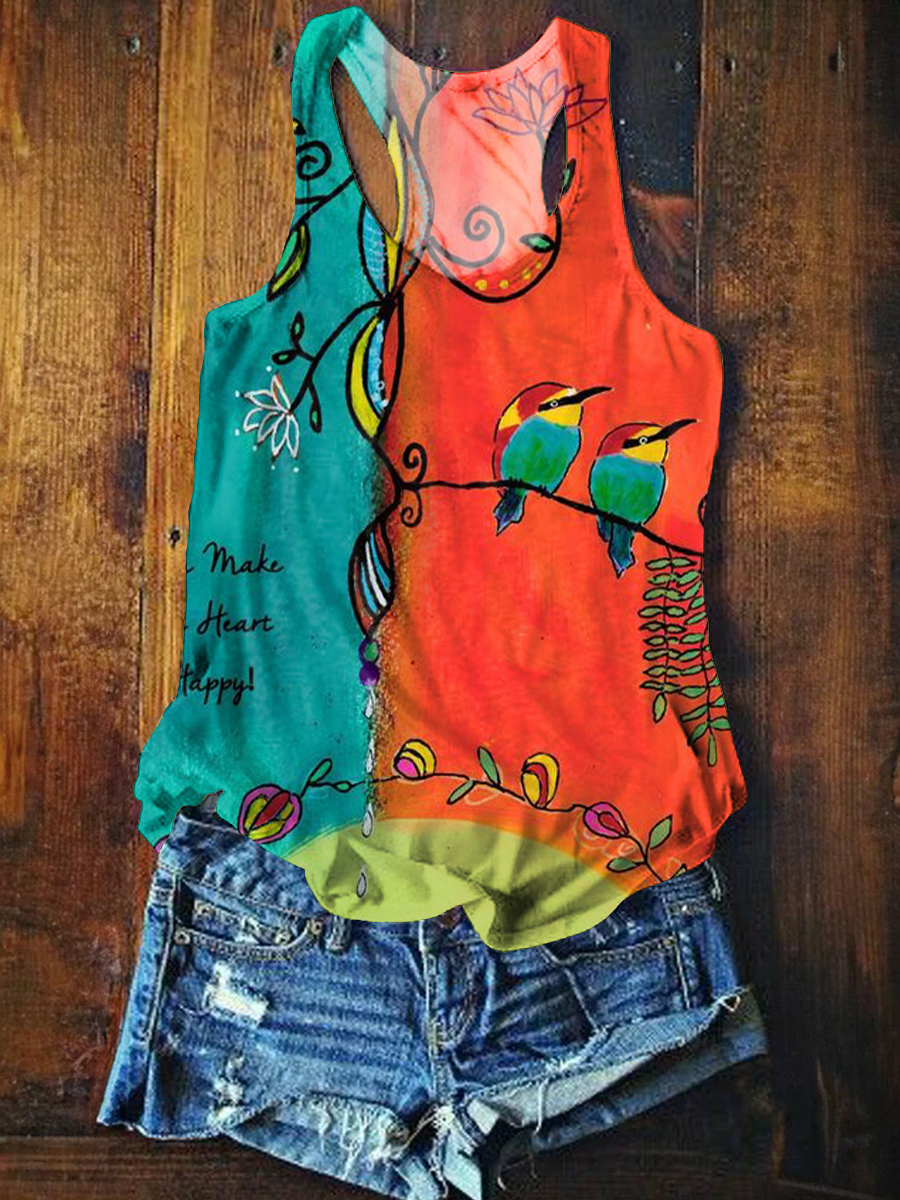 Women's Vintage Floral Bird Art Print V-neck Casual T-Shirt