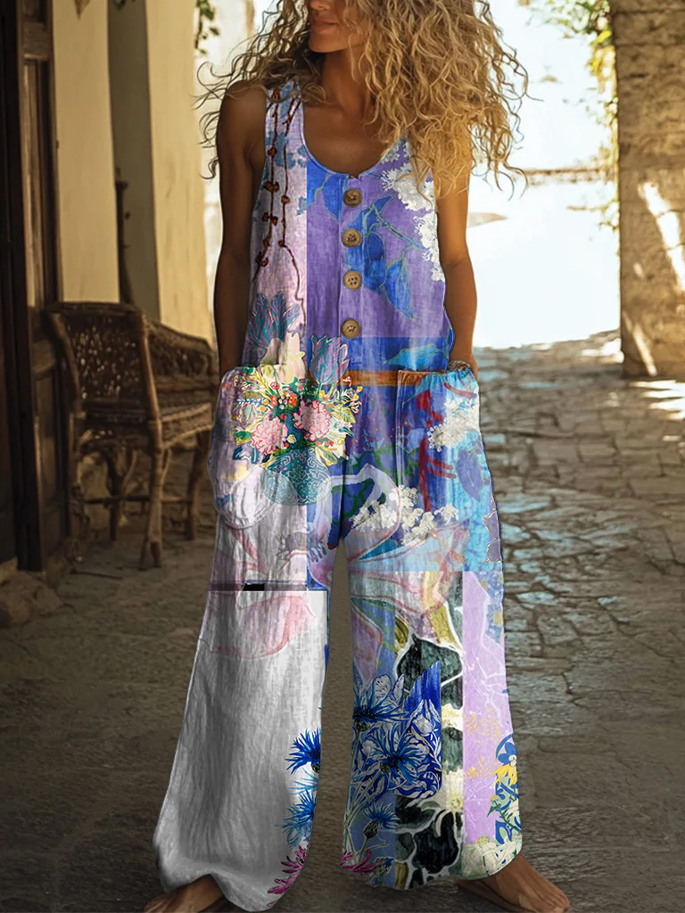 Women's Vintage Floral Embellished Pattern Art Print Casual Suspenders Wide Leg Pants