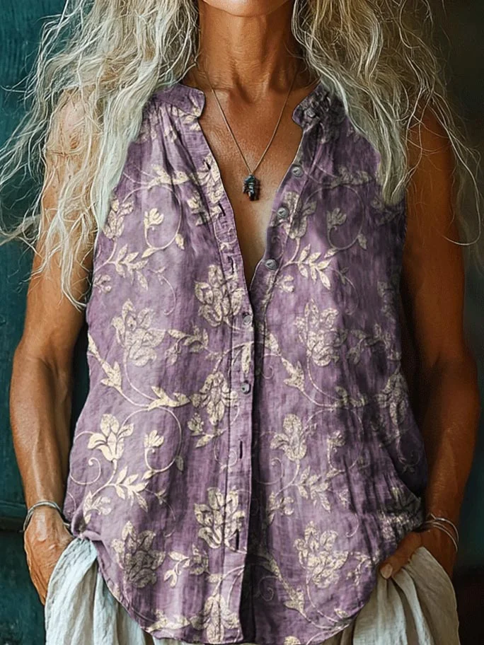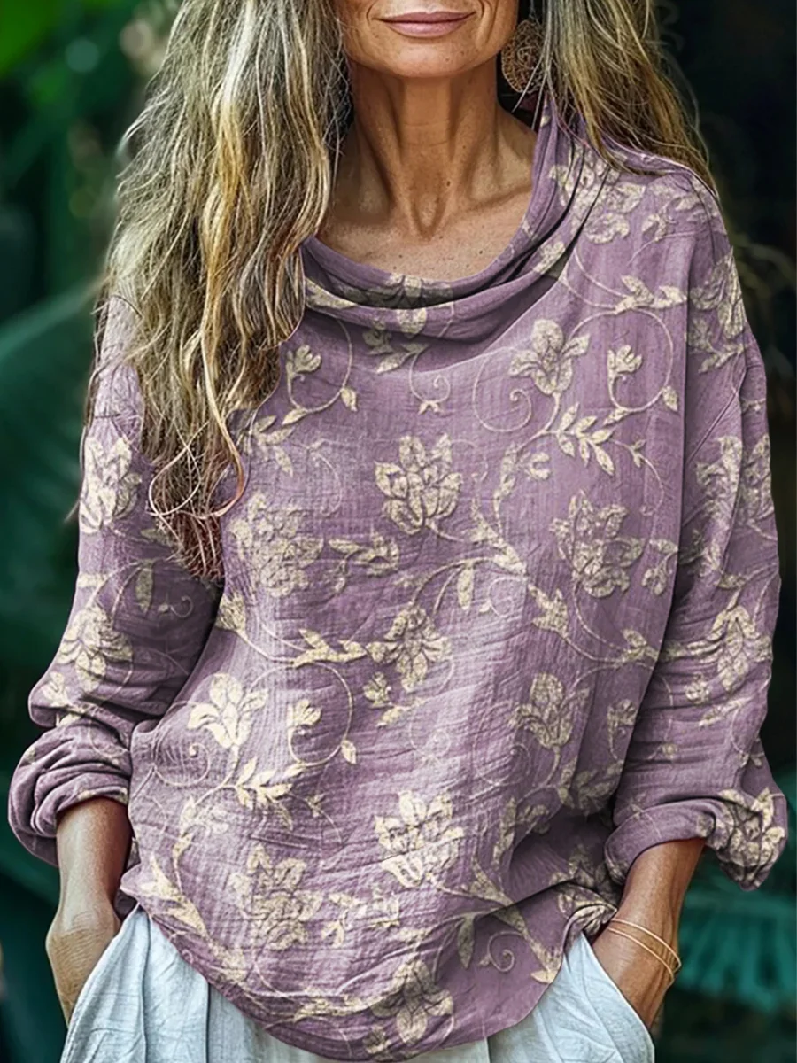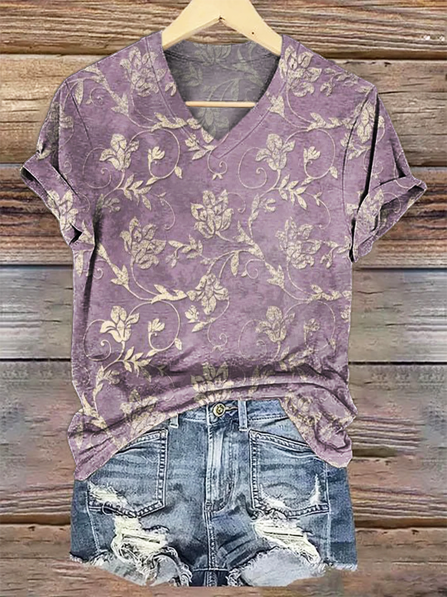 Women's Vintage Folk Art Floral Pattern Print V-neck Casual T-Shirt