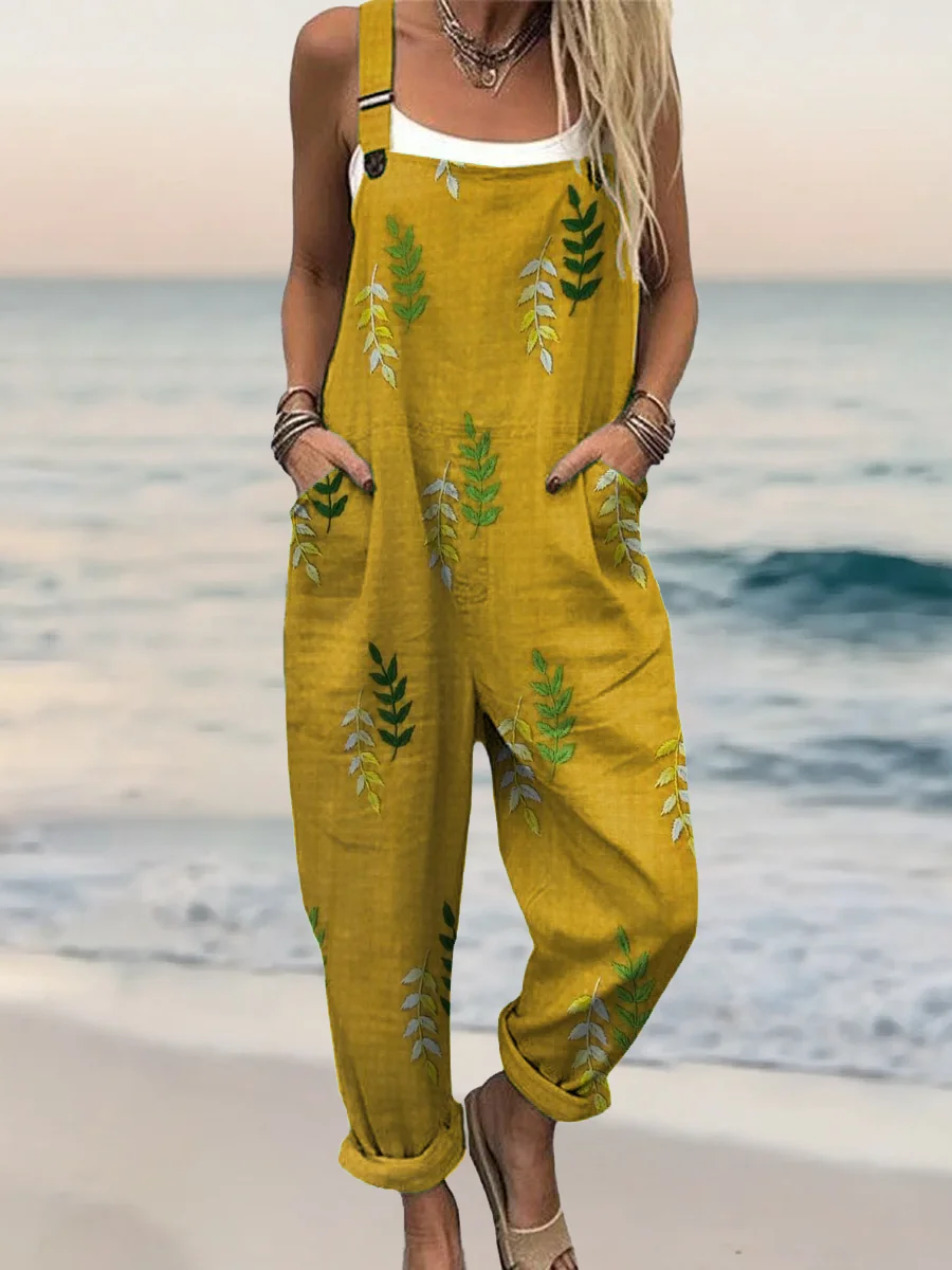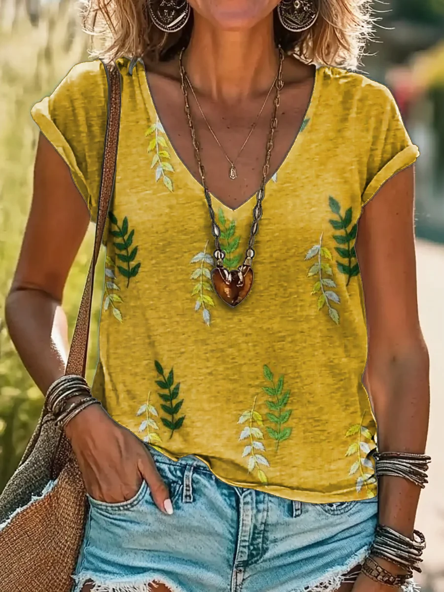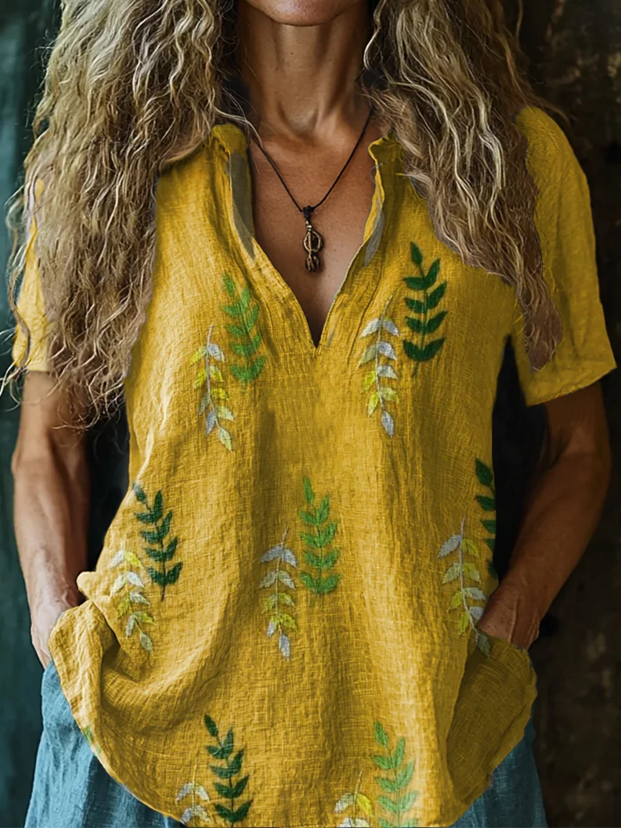 Women's Vintage Leaf Art Print Casual Cotton Linen Shirt