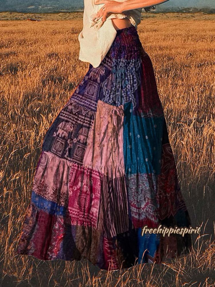 Women's Vintage Patchwork Hippie Print Cotton Pocket Skirt