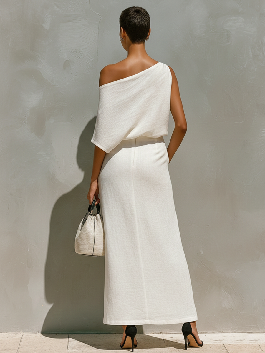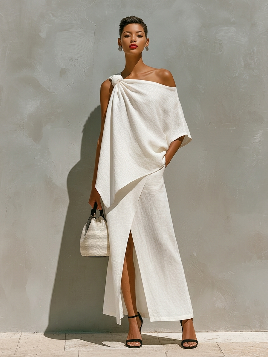 Product Name: Women’s White Linen Set With One-Shoulder Knot Detail & Front Slit, Timeless Minimalist-Resort Style Set