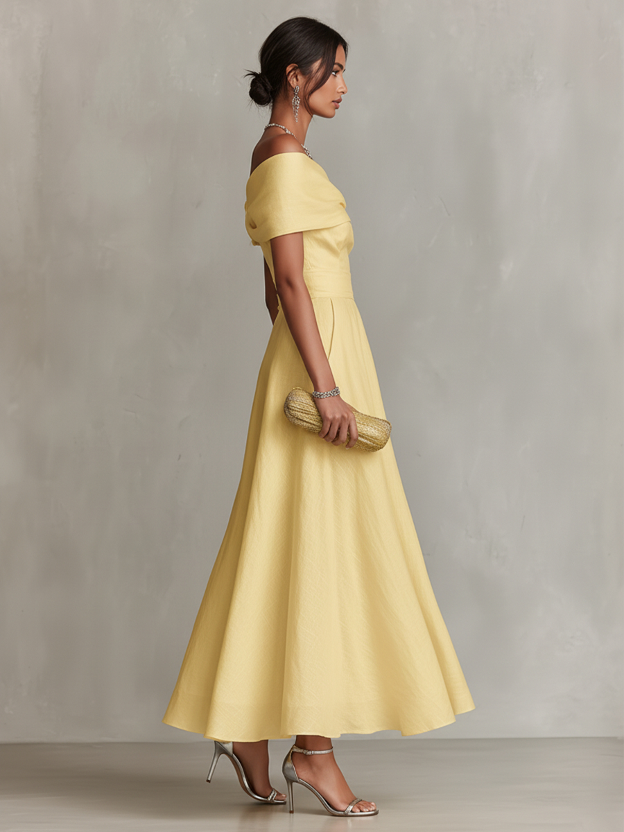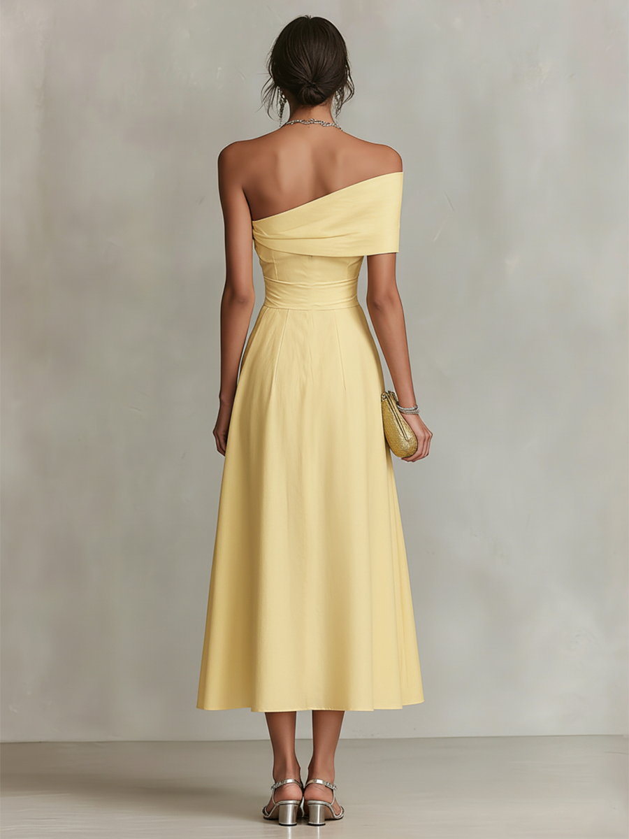 A yellow one-shoulder linen dress with a fitted waist. It delivers a timeless elegant-chic look with a flowing, midi-length skirt.